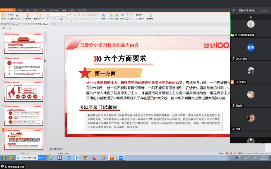 2021年4月8日上午10:00,研究生黨支部通過(guò)騰訊會(huì )議平臺,組織開(kāi)展2021年第一季度專(zhuān)題黨課《學(xué)習總書(shū)記在黨史學(xué)習教育動(dòng)員大會(huì )上的講話(huà)——學(xué)黨史 悟思想 辦實(shí)事 開(kāi)新局》。研究生院支部共44名黨員參加了黨課。